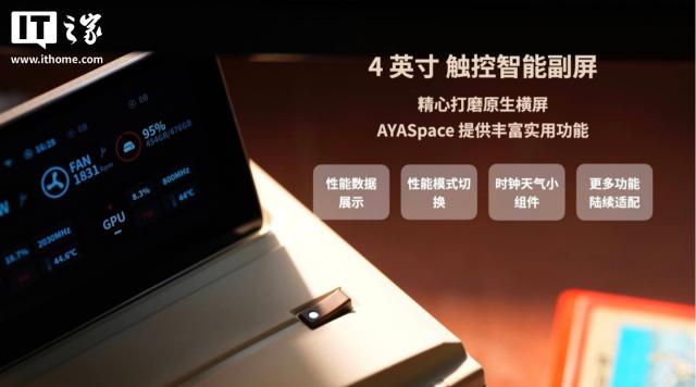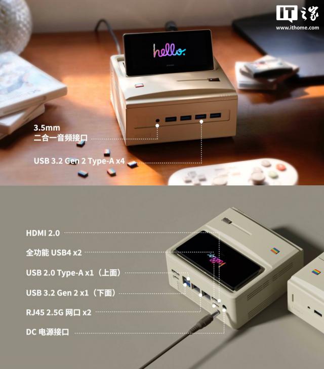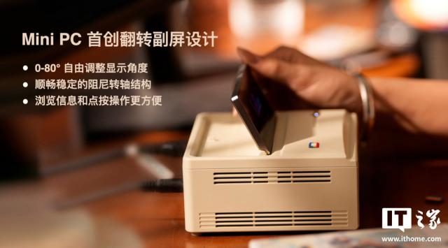 这款迷你主机采用米色配色,向苹果致敬。 Macintosh 和任天堂 NGC 设计,配置了一块 4 英尺可调视角触摸翻转屏幕(支持 0-90 度悬停),可以作为实现性能监控、快速调节等功能的副屏。