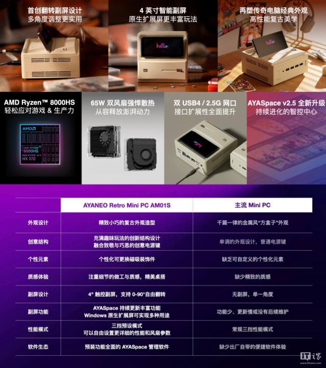 IT 世家 3 月 22 日消息,AYANEO 现在已经公布了旗下 AYANEO Retro Mini PC AM01S 迷你主机的实机照片及具体规格信息,可选锐龙 AI 9 HX 370 Cpu,配有旋转副屏,价格尚未公布。