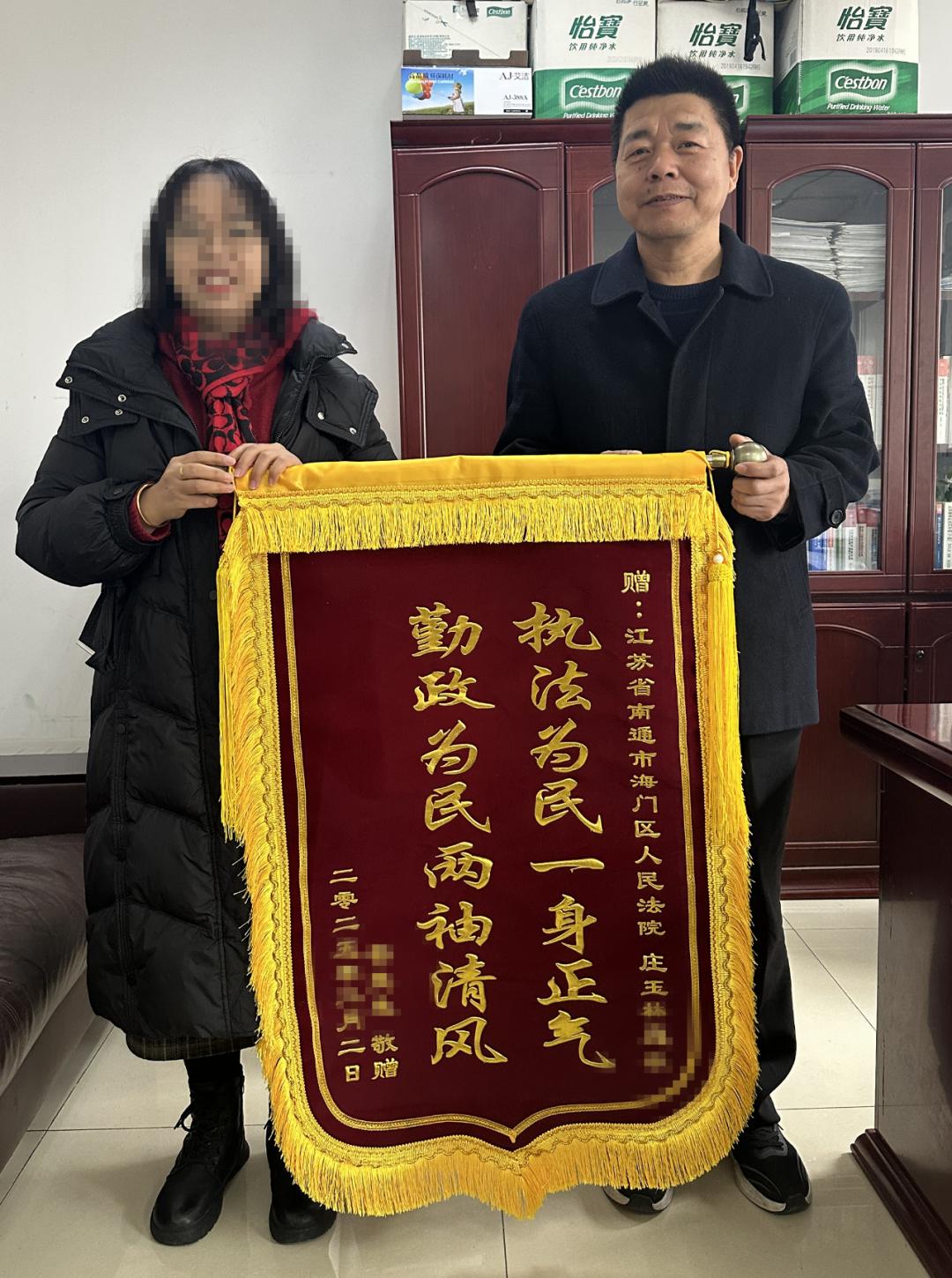 最近,海门法院执行局庄玉林法官收到了申请执行人汤某某送的横幅,感谢他在节日期间为她付了钱。
