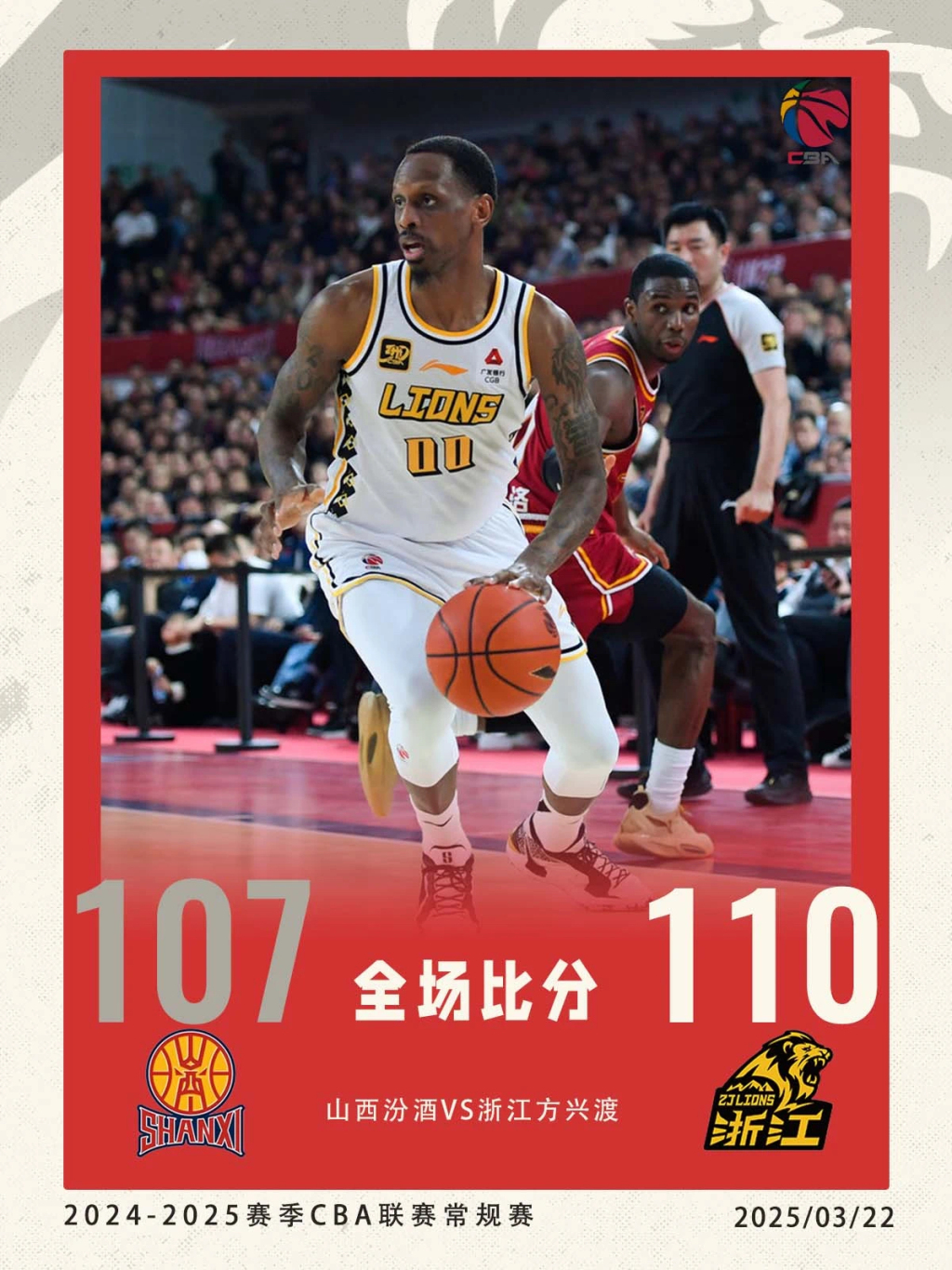浙江省广厦险胜山西,提前三轮锁定CBA常规赛冠军