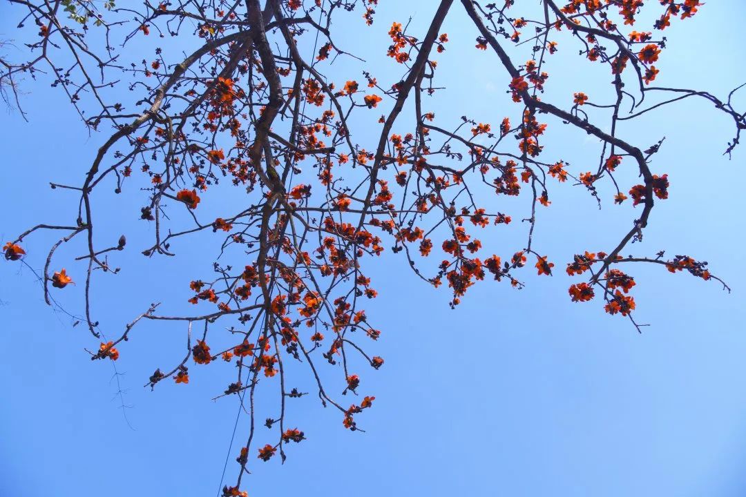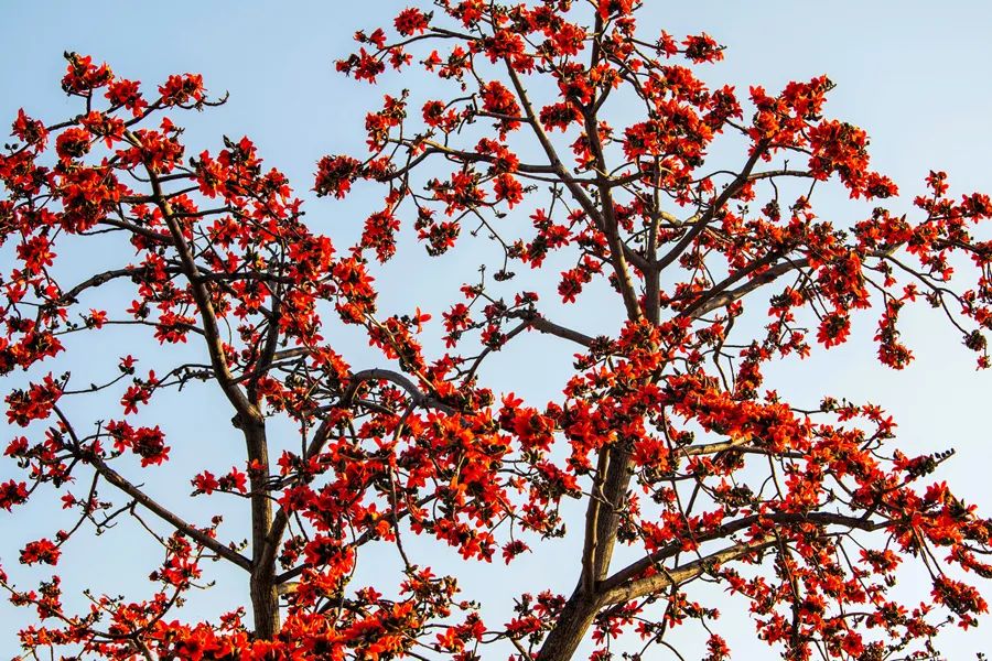 木棉,又名红茉莉、红棉、英雄花等。,广泛分布在热带气候和亚热带地区。在岭南地区,每年三四月份,满城的木棉都会绽放,五瓣花开,形似灯笼,颜色是红色、橙色或大红色。花落后,花不褪色,优雅地告别世界。
