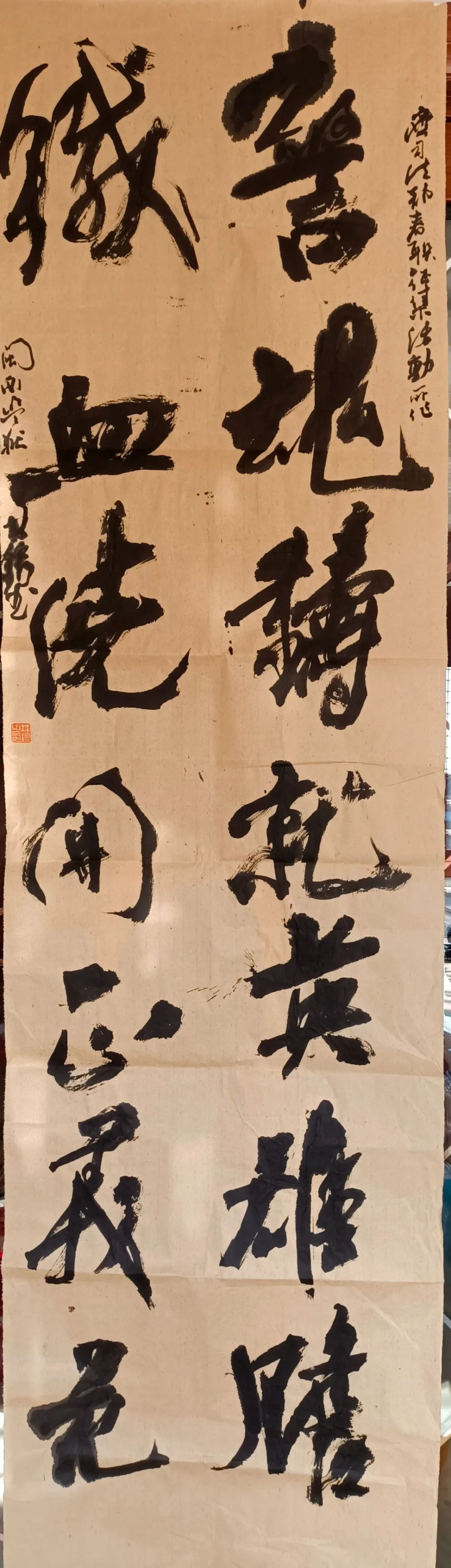 “警魂,铁血联”主要来源于米邈和王铎的书风。笔画开放,强大,融入碑文,让每一个字都显得意气风发,简单豪迈。字势跌宕起伏,穿插避让,包括“灵魂”、“花朵”等字内空间收紧的字,以及“只是”、“正”字外空间释放的字,正确处理了伸缩矛盾的关系。