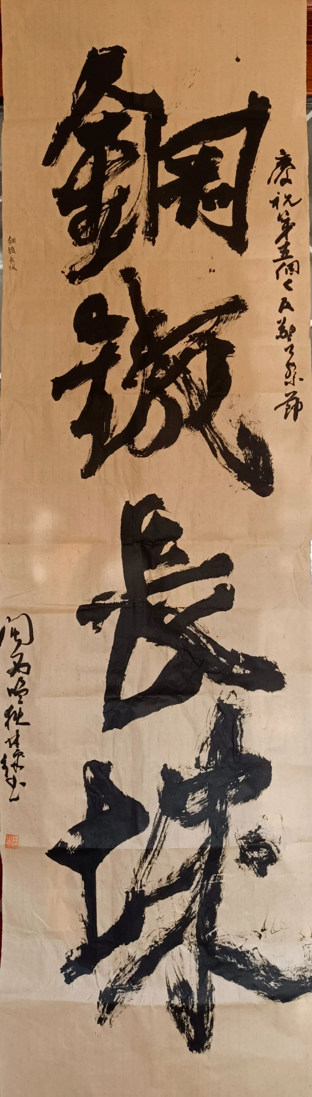 钢铁长城六尺对开作品,拿明清一路大字榜书,端庄大气,字势磅礴。既有正书的稳重,又有草书的流动优雅。整体效果采用“伸缩收放”的规则形式。