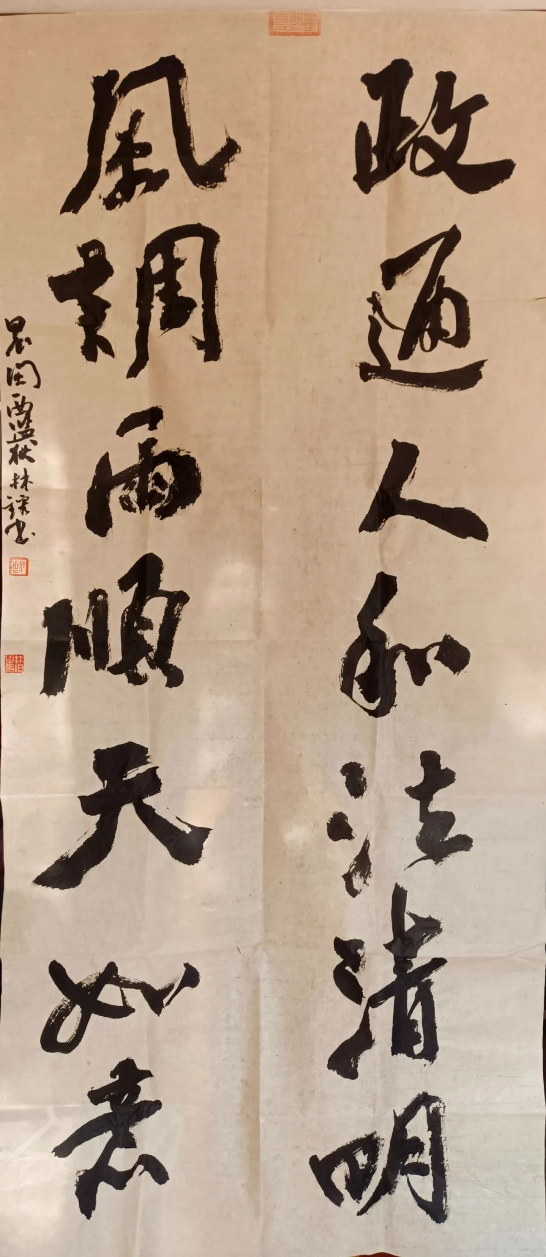 “政通,风调”是一对司法、行政、法治对联,将法治宣传、法治文化与书法艺术紧密结合。作品整体魅力流畅,大小交错。它体现了对政治人民和谐、和谐社会、人民安家乐业的美好祝愿!