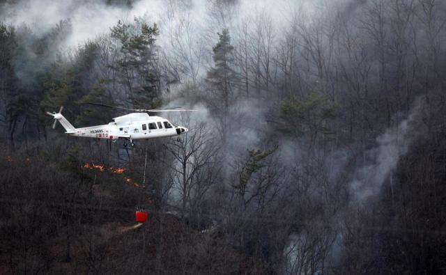 3 月 22 日本,韩国庆尚北道义城郡周边的救援直升机参加了灭火。新华社 / 纽西斯通讯社