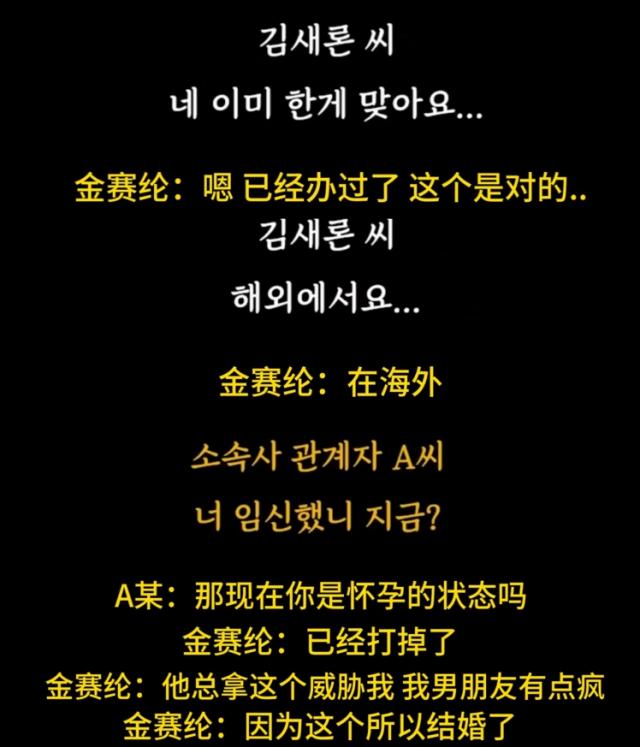 在金赛纶对话中有很多卡片的音频中,金赛纶说她在纽约和圈外的男朋友结婚是因为她怀孕了,但是对方对她有很强的控制欲。她被迫怀孕结婚,但她放弃怀孕是因为她不想被控制。