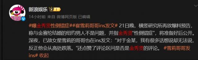 陆续宣布起诉金赛纶的遗属,遗属也预测会曝光更快的内容,内容会超过金秀贤目前曝光的所有内容。与此同时,已故艺术家崔雪莉的哥哥也在社交平台上。