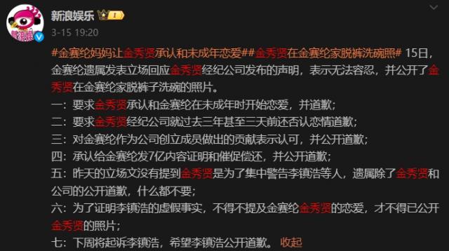 金赛纶的遗属也对外公布了立场,明确表示要求金秀贤与金赛纶在其中。 18 岁前恋爱道歉,为数次否定恋情道歉,承认对金赛纶追债施加压力而公开道歉,除此道歉外,其它都不需要。