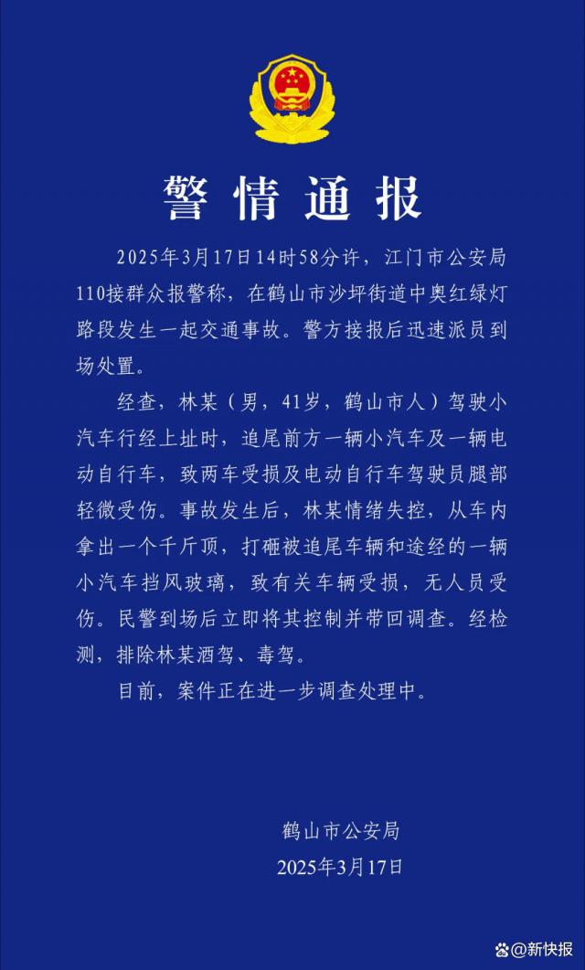 3 月 17 日前,有网友发布视频称,江门鹤山,一名男子驾车撞倒外卖小哥,追尾前车,随后拿出千斤顶砸对方车。