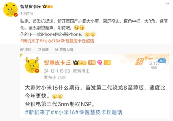 这位博主透露,一款首发机加速,新开案国产护眼大小屏,直屏窄边,斜框,大框, R 角,轻薄,全部潜望超声。虽然没有透露这个型号,但是在微博下面贴了一张之前的截图,图中提到了小米。 16 系列。小米,他指出 16 第二代骁龙系列将首发 8 至尊版,新移动平台将采用第三代台积电 3nm 制程打造。