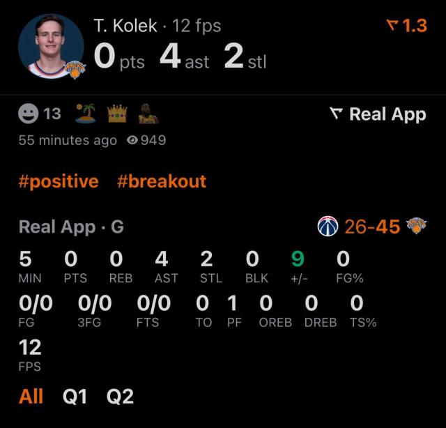 今日,科莱克在第二节获得了上场机会,替补上场,结果这次上场直到半场结束,都没有下场,每节都打满了。 12 一分钟,一个人送出去 7 个助攻 3 一个断球,帮助球队打球。 35-20 单节比分,正负值 15。