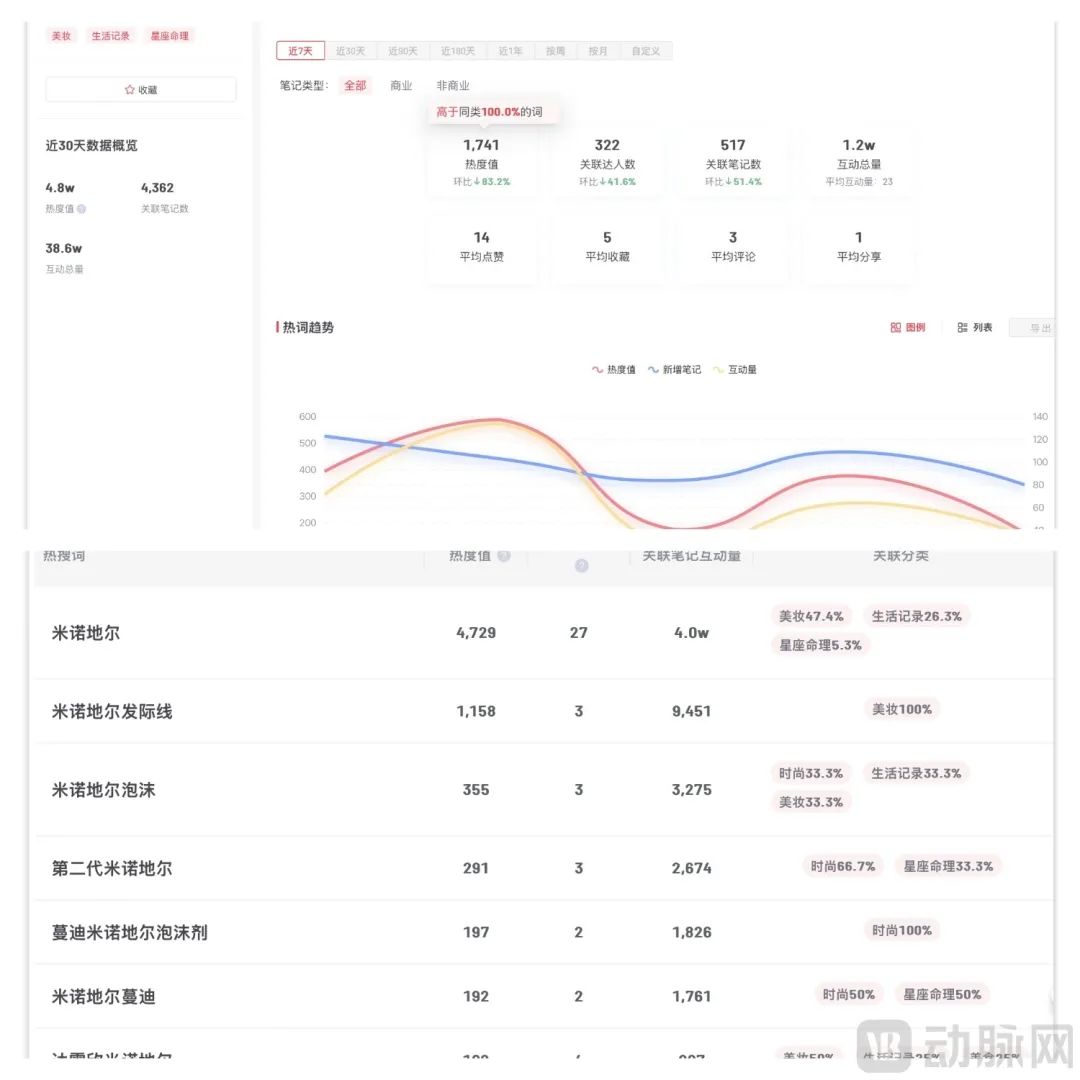 可以看出,头部品牌将产品和服务结合起来,迎合年轻一代对外在形象的向往,成功将防脱发的专一场景延伸到生活领域。从第三方数据平台的分析可以看出,米诺地尔的场景关系也偏向于美容、生活记录、时尚等关键词。小红书平台的分享内容也逐渐从简单的治疗脱发的记录走向仪器管理的生活化常态。