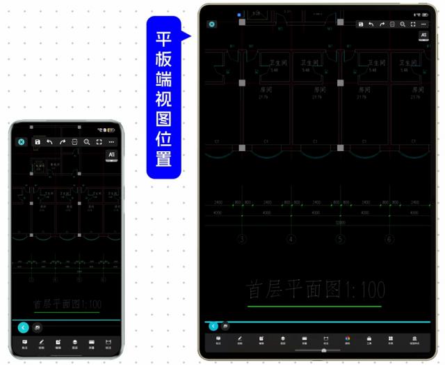 以前,我们跟着 CAD 在与图王的R&D总监李冬沟通时,他还向我们展示了图纸行业的应用延续:在手机上浏览图纸,可以通过应用延续快速切换到其他设备进行修改,并在 Pad 上部打开,视图位置与手机完全相同。
