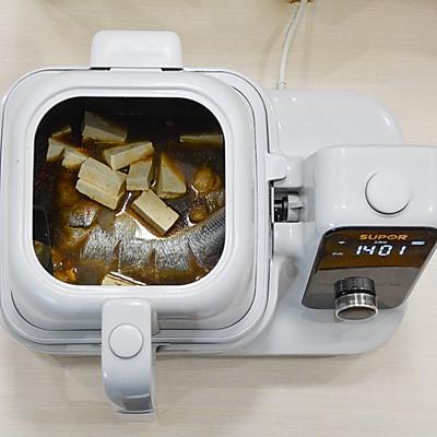 6、鱼和豆腐放入锅中,盖上盖子,中火煮沸。 15 分钟