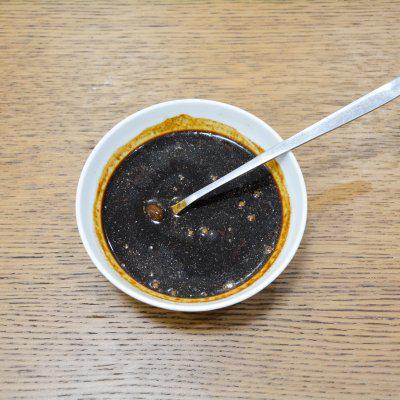 2、【调味汁】入碗搅拌均匀:酱油、酱油、香醋、米酒、黄豆酱、盐、鸡精、白胡椒。