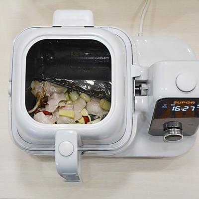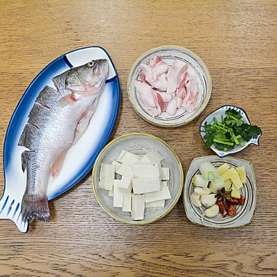 1、鲈鱼清洗干净,净重 420 克,后背切 2 厘米宽,腹部不要断开;皮五花肉切片,豆腐切成大块,香莱切成小块;放在锅里:八角、洋葱、姜片、大蒜、干红辣椒。