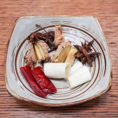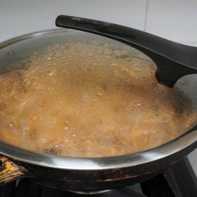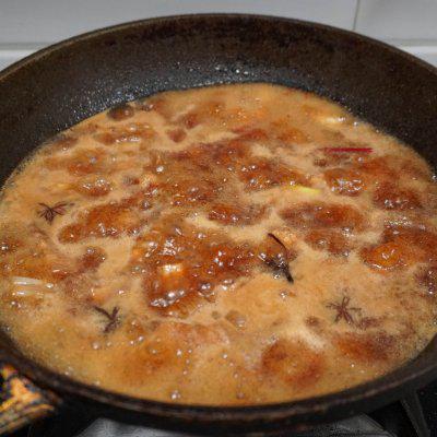5、倒入米酒、盐、洋葱、姜片、八角、干辣椒炒至水蒸气消失,倒入酱油、酱油上色。