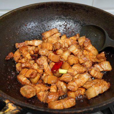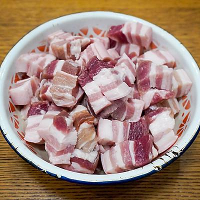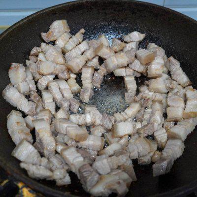 4、锅内下油,五花肉块中小火爆锅产生多余油脂,有轻微焦边。