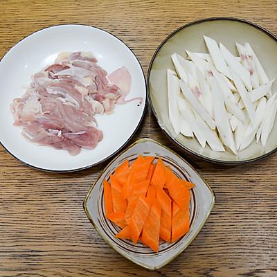 1、鸡肉大腿去骨,鸡肉皮切粗条;铁棒山药洗净,胡萝卜半根刮皮