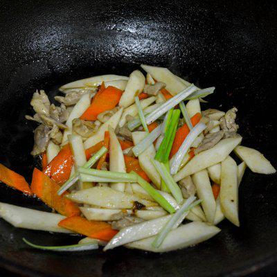 6、撒盐,鸡精,翻炒 2 分分钟,放葱段,炒 10 秒,熄火,起锅