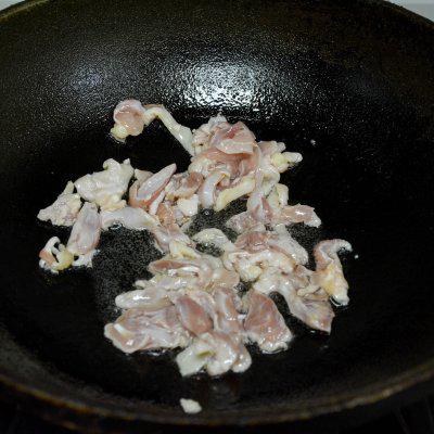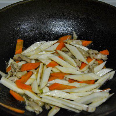 4、放入不易熟的胡萝卜片爆锅 1 几分钟后,鸡肉表面全部变色,胡萝卜微软