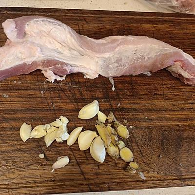 1、一块新鲜的五花肉,肉上有洞,味道鲜美。孩子比较喜欢吃瘦叉,所以买的肉比较瘦。准备蒜和姜切成小块。