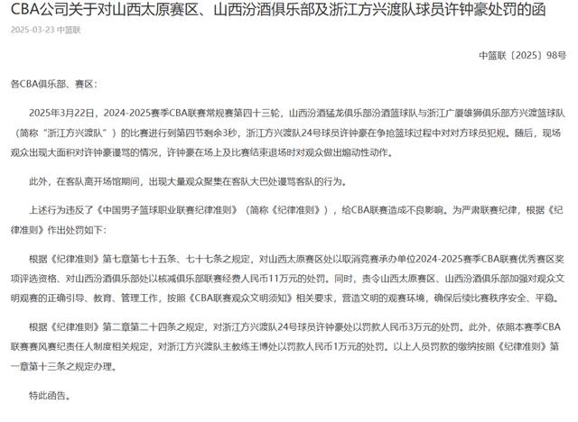 如今 CBA 罚款已公布,其中俱乐部已减少。 11 联赛资金1万元,太原赛区取消优秀赛区评比资质。这种惩罚没有悬念,确实对客队影响很大。当然,许钟豪做错了什么,但球迷这样做是非常不理智的。