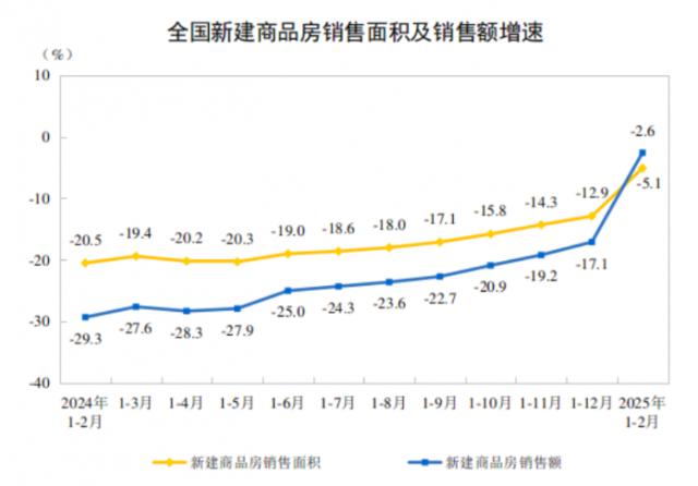 1-2 月份,新建商品房销售面积同比下降 与去年相比,减幅收窄了5.1%。 7.8 %。新建商品房销售减少 降幅收窄了2.6%。 14.5 %。