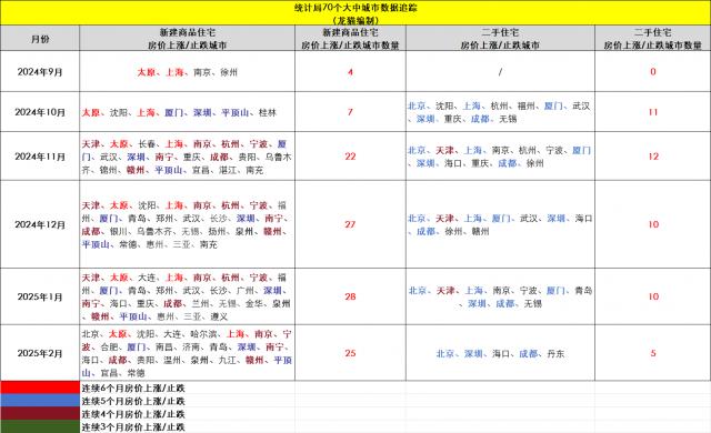 2 月份 70 一个大中城市新建商品房的房价指数,止跌的城市 25 个,相比较 1 月份的 28 一个止跌的城市,减少了 3 个。