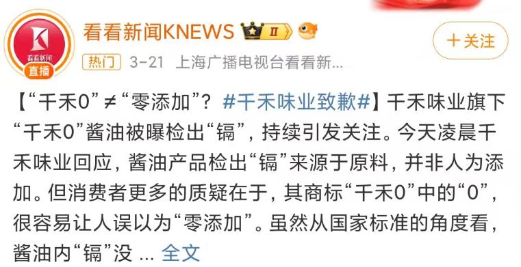 事情起因是某媒体发布了一个测评,题目为《零添加酱油测评③:12款检出镉,7款检出总砷,部分厂商回应》,并在微博设置了话题#零添加酱油12款检出镉7款检出总砷#,迅速冲上热搜。