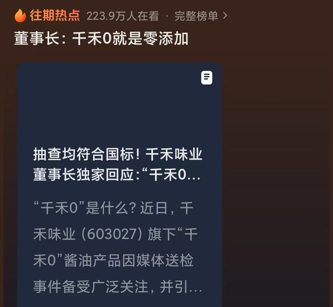 连续几番澄清、检测结果的公示,人们才恍然大悟。一些人庆幸,还好没冲动把家里的千禾扔了。