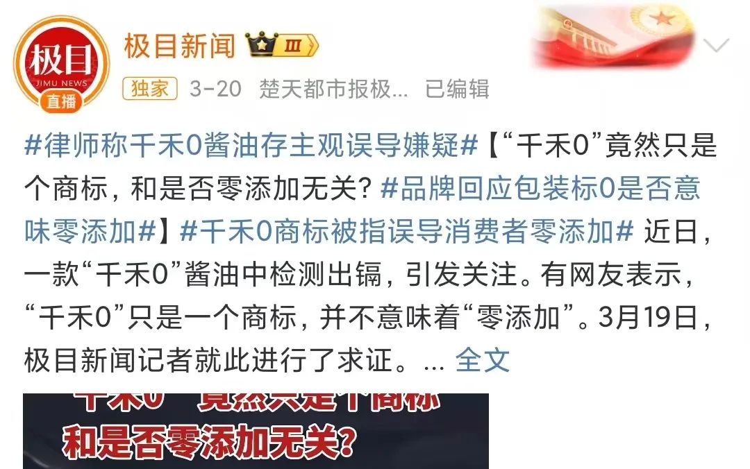 很快,#千禾0商标被指误导消费者零添加#等相关话题出现在了热搜榜上。