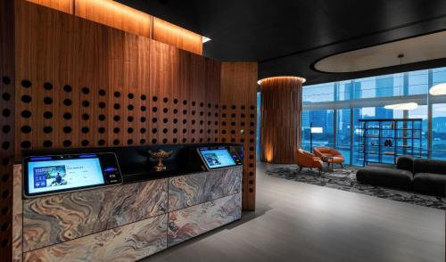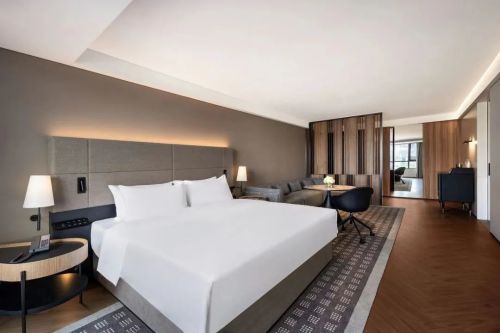 坐在客房的书桌前,住客只需轻轻按下桌旁的按钮,就能一键开启“工作模式”:客房的主灯熄灭,只剩下桌面上方精准聚焦的阅读灯,与墙角散发着暖黄光晕的氛围灯带遥相呼应。酒店房间瞬间变成一个让人能全神贯注工作的舒适空间。