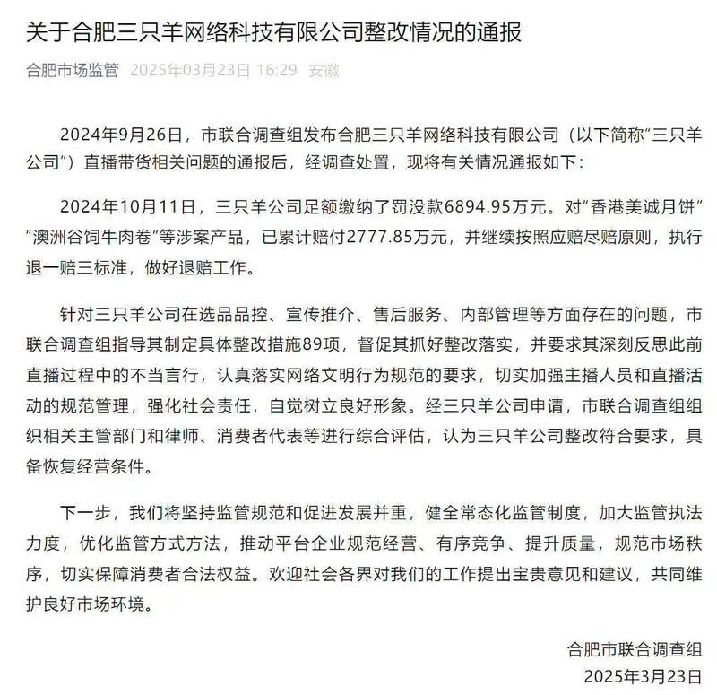 3月23日,合肥市联合调查组发布了关于三只羊网络科技有限公司的整改通报: