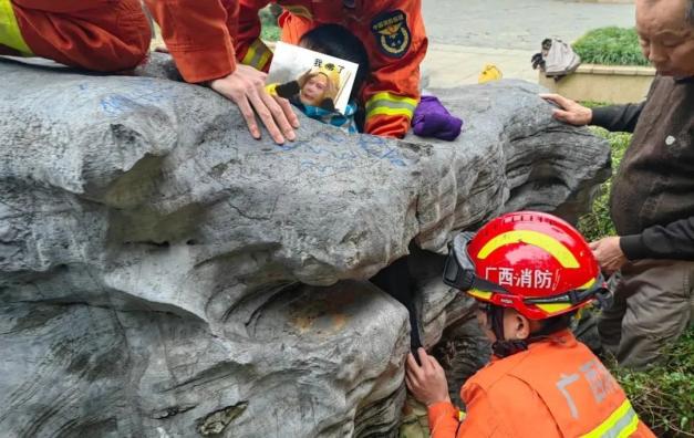 2024年1月5日17时30分左右,广西柳州雀儿山公园一名6岁左右的小男孩卡在假山的石缝里,无法挣脱。经过消防救援人员的努力,大约5分钟后,小男孩被成功救出。