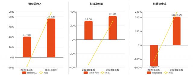 企业总营业收入为 21.39 亿元。归母净利润为 2.11 十亿元。经营活动现金净流入 5507.51 万元。