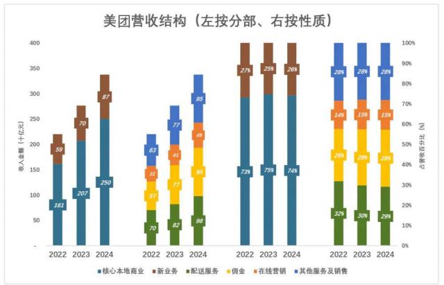 2024 年度,配送服务收入 980.7 亿、占比 29%;佣金收入 953.4 亿、占比 28.2%;网上营销收益 492.4 亿、占比 14.56%;其它服务和销售收入 949.4 亿、占比 28.1%;合计 3376 亿。