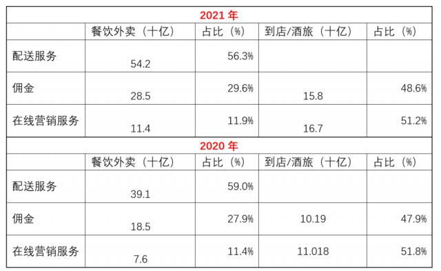 2021 每年,佣金增加到 529 亿;其中仍然存在 54% 来自配送服务,30% 来自到店 / 酒类旅游,其它来自新业务;
