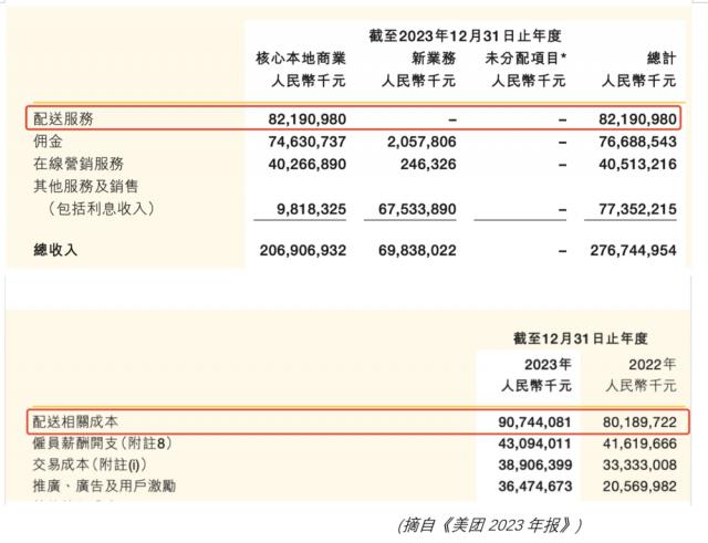 以 2023 年为例:2023 年度“配送服务”收益 821.9 十亿,“配送相关费用” 907.4 亿,毛亏损 85.5 一亿(注:下图截图自美团。 2023 年报》,P274、P277)。