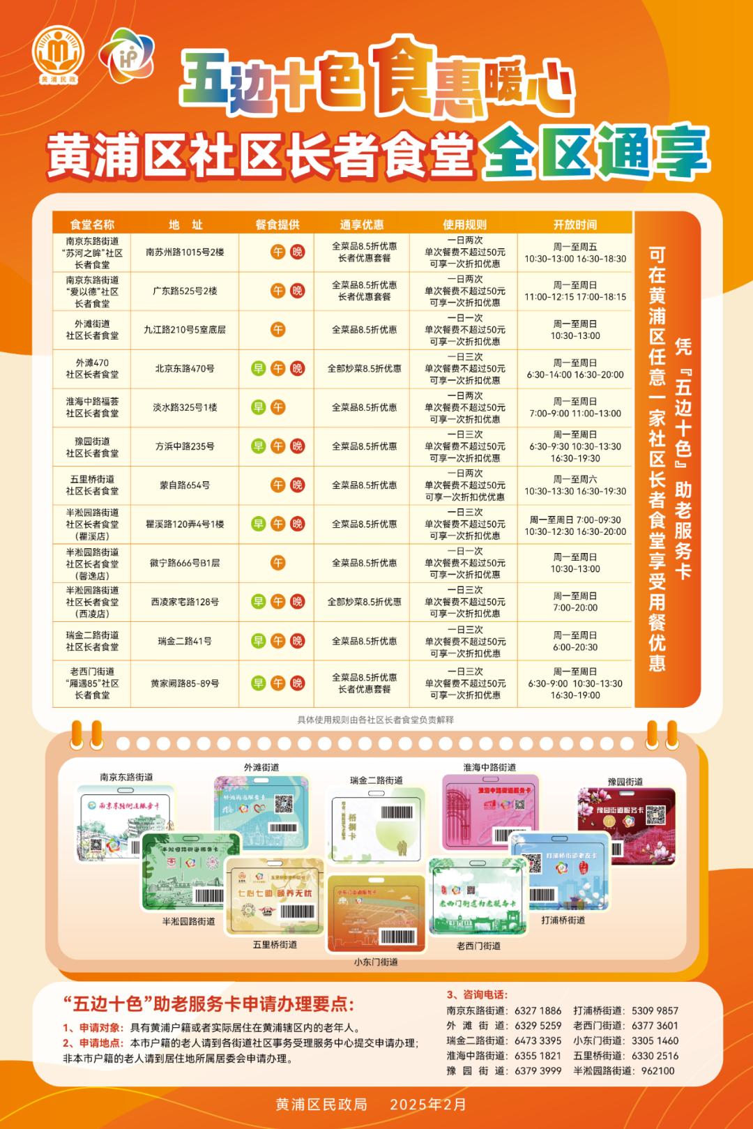 2月12日,老西门街遇到85社区老年食堂,正式加入黄浦区“全区共享”阵营。户籍所在地或居住地在黄浦的老年人,可以通过12家社区老年食堂,包括“五边十色”老年服务卡,共享12家社区老年食堂的8.5折优惠用餐。此外,近年来推出了4批老年餐厅,全区共有65家餐厅共享。