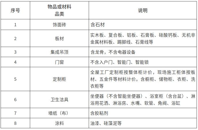 补贴物品及材料包括饰面砖、板材、集成吊顶、门窗、定制柜、卫生洁具、壁纸(布)、油漆等8类。补贴金额按可补贴品类实际购买价格的15%计算,每个客户每套房最多可补贴一次,不超过2万元。