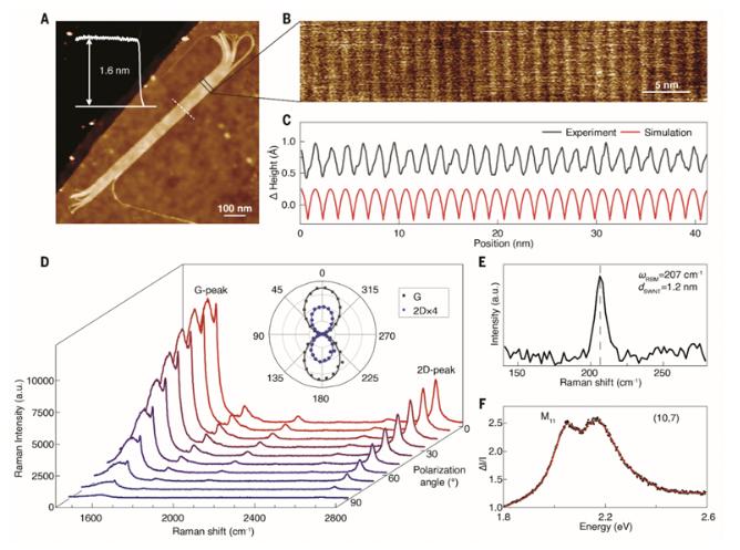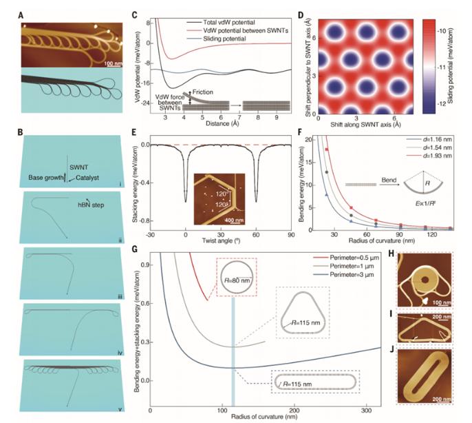 化学气相通过纳米颗粒催化沉积。(CVD)在生长技术方面,研究团队获得的所有碳纳米管阵型都由相同的手工碳纳米管组成,这些碳纳米管相互平行,排列紧密,间隔固定在0.33纳米。理论分析表明,这种完美阵型结构的形成来源于碳纳米管与六方氮化硼基底之间的超润化摩擦特性和范德华在碳纳米管之间的相互作用。碳纳米管在生长过程中可自由滚动,找出最低能量结构,最终通过自组装形成范德华晶体结构。