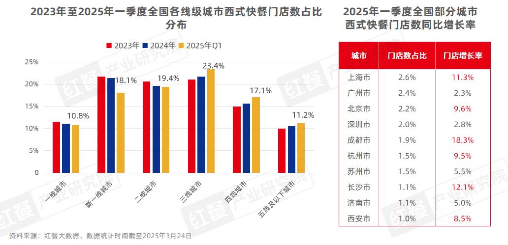 从线级城市分布来看,红餐大数据显示,截至2025年3月,三线及以下城市的门店数量占比持续提升,其中三线城市、四线城市和五线及以下城市的门店数占比分别较2024年提升了1.6、1.5和0.7个百分点,表明西式快餐品牌正加速向下沉市场渗透。