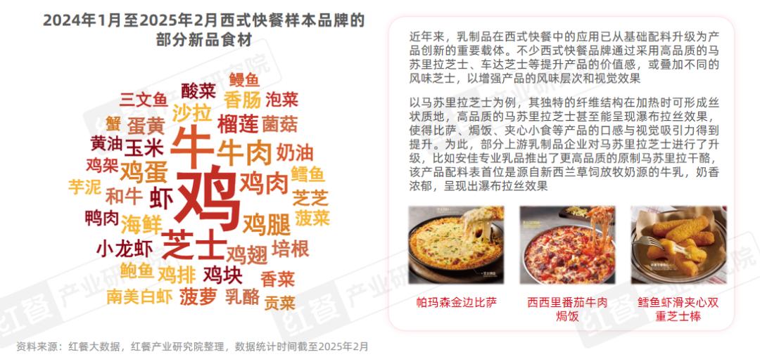 此外,芝士、黄油、烹饪稀奶油等乳制品在新品中的应用也较为突出,并逐渐从基础配料升级为产品创新的重要载体。红餐大数据显示,2024年至2025年2月,新品名称中含有“芝士”的新品占比为13.9%,如辣芝士流心鸡块、芝士烟熏风味汁汁和牛堡、奶香芝士多多披萨、意式肉酱芝士焗饭等。不少西式快餐品牌通过采用高品质的马苏里拉芝士、车达芝士等提升产品的价值感,或叠加不同的风味芝士,以增强产品的风味层次和视觉效果。