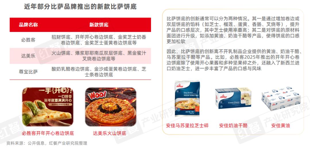 因此,比萨饼底的创新离不开乳制品企业提供的芝士、黄油、酸奶、奶油等产品。比如,必胜客2025年推出的开年开心卷边饼底除了使用开心果酱和多种坚果碎之外,还融入了新西兰进口奶油芝士,进一步丰富了产品的口感与风味。