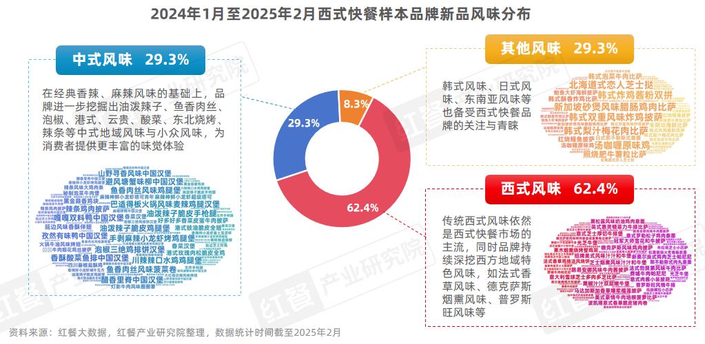 红餐大数据显示,2024年1月至2025年2月,监测的西式快餐样本品牌上新的主食和小吃产品中,西式风味占比最高,为62.4%;其次是中式风味,占比为29.3%;其他诸如韩式、日式、东南亚等风味的产品占比为8.3%。