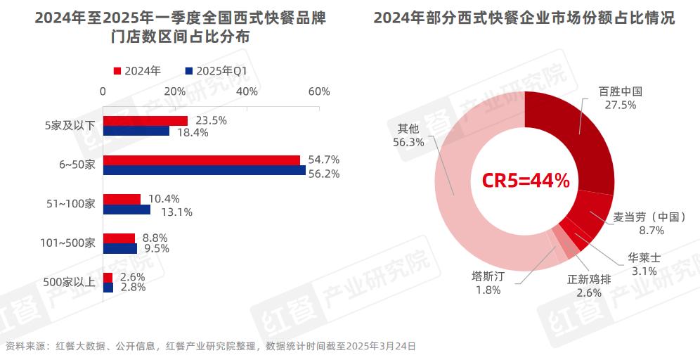 从市场集中度来看,2025年一季度,西式快餐门店数TOP10品牌占据了全国22%的门店;而2024年西式快餐年度营收规模前五企业的市场份额占比则达到了44%,彰显出头部品牌的强势地位。