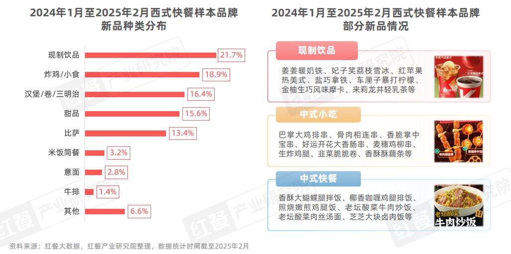 从新品的所属类别来看,饮品成为品牌产品创新的重点。2024年1月至2025年2月,西式快餐样本品牌的新品中,现制饮品的占比高达21.7%,超过了传统的炸鸡/小食、汉堡/卷/三明治的占比,位列第一。