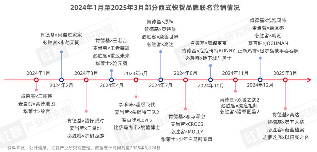 为了迎合年轻群体的消费喜好,部分品牌还积极与虚拟IP、手游、动漫、影视以及知名品牌等开展跨界联名活动。例如,2024年1月至2025年3月期间,肯德基先后与三丽鸥、泡泡玛特、海绵宝宝、蛋仔派对等知名IP及品牌展开了20余次联名营销;麦当劳、华莱士还与故宫、三星堆等传统文化IP展开创新联动。这些联名活动不仅为品牌持续注入了活力,更是探索出IP流量向用户转化的新路径。