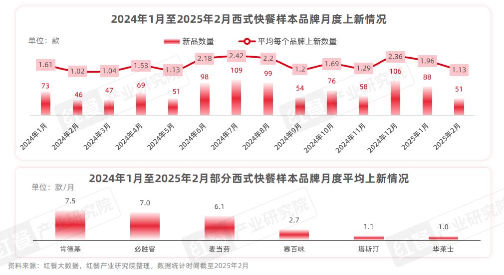 近年来,西式快餐品牌加速产品创新迭代,以持续提升市场竞争力。据红餐大数据,2024年1月至2025年2月,监测的45个西式快餐样本品牌累计推出新品超1,000款,其中,肯德基以平均每月7.5款的上新速度领跑赛道。